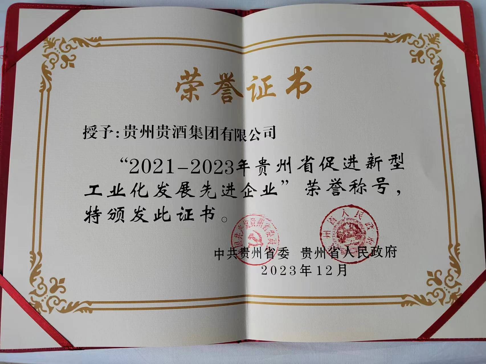 喜讯!贵酒公司荣获2022年贵州省规上工业企业进步企业